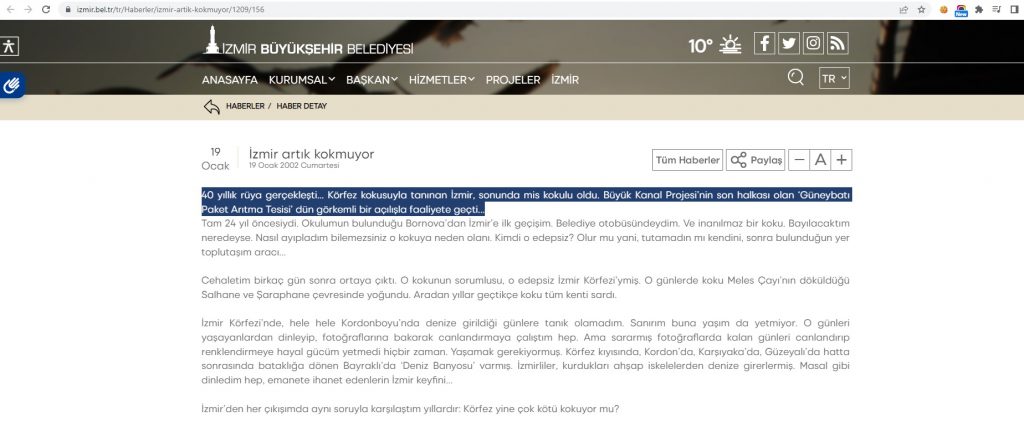 İzmir Büyükşehir Belediyesi Resmi İnternet Sitesi’nde yer alan “İzmir Artık Kokmuyor” başlıklı 19 Ocak 2002 tarihli haberde aşağıdaki içerik yer almaktadır. Haber Linki İçin Tıklayınız !