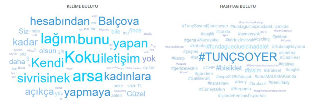 Paylaşılan içeriklerde kullanılan kelime sıklığına baktığımızda ise en yoğun kelimenin kokuyor olduğu, yoğunluğu yüksek diğer kelimelerin ise lağım, sivrisinek, arsa, kadınlara olduğu görülmektedir. Hashtag kullanım sıklığına baktığımızda ise #tunçsoyer, #bisiklet kelimelerinin öne çıktığı görülmektedir.