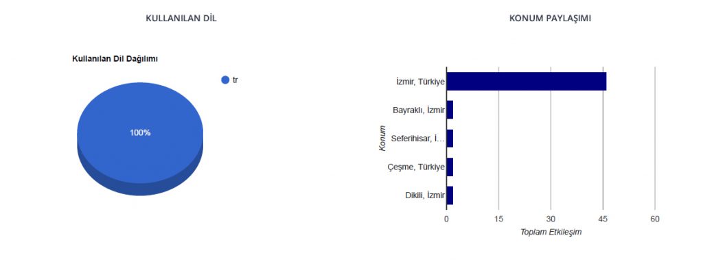 İzmir Büyükşehir Belediye Başkanı Tunç Soyer hakkında paylaşılan içeriklerin dillerine bakacak olduğumuzda içeriklerin tamamının Türkçe dilinde yazıldığını görebiliriz. Servis sağlayıcılardan alınan konum verilerine dayanarak, paylaşılan tweetlerin tamamının İzmir’den yapıldığı görülmektedir.